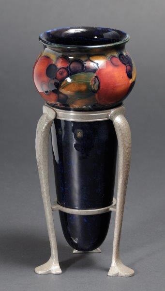 Items like this show the collaboration between Moorcroft and other people working for Liberty. The addition of metalwork meant the new shapes could be developed in ceramics. The Art Nouveau styling of the metalwork complemented the designs of Moorcroft’s ceramics.