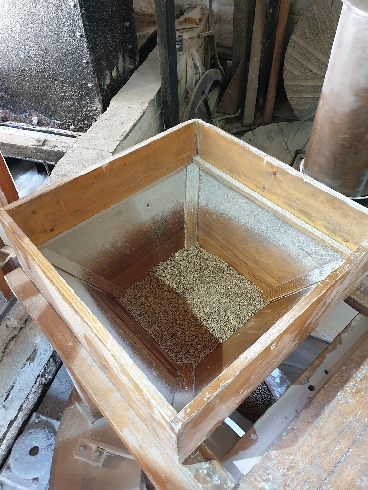 and then repeating the journey! At present I do this twice before the mill is running at the right speed and the stones are the correct distance apart. Both of these things are crucial as if the mill runs too quickly or too slowly it can create problems for the machinery or produce too little flour and if the stones are too far apart or too close together the flour is too coarse or too fine.