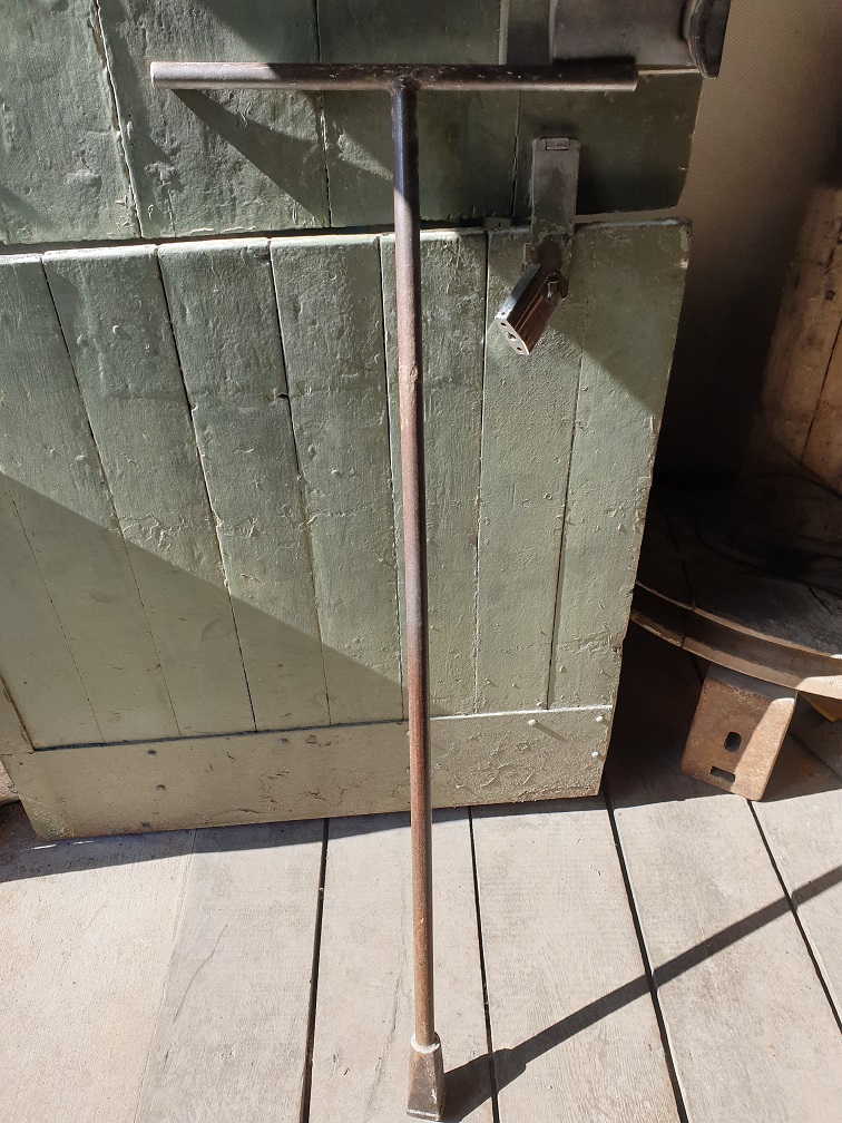 All is now ready in the mill so we now need to turn the power on. In our case this means opening a sluice gate (known as a penstock valve) at one end of the mill pond using a large metal “key”