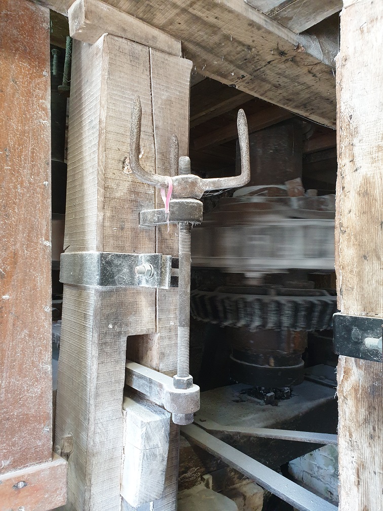 and there are enough sacks of grain on the stone floor we can start to get ready to mill. We keep the millstones apart overnight to let air flow between them so we need to lower them slightly before we mill. This is done using the tentering screw