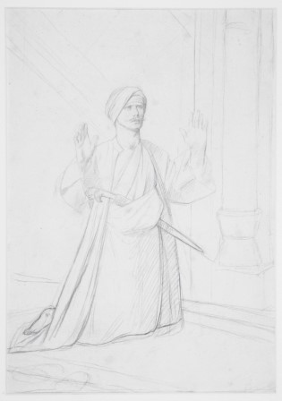 This simple, yet detailed, sketch shows a man kneeling with his hands raised. He is wearing traditional Arab clothing including a turban. He has a sword through his waistband. He is believed to be participating in tradition Arab prayer. The founder of Islam, Muhammad was born in Mecca and it is towards this religious centre that Muslims turn five times daily in prayer. Gerome often painted men facing east in prayer at different stages in their worship, with some standing, some seated or kneeling.