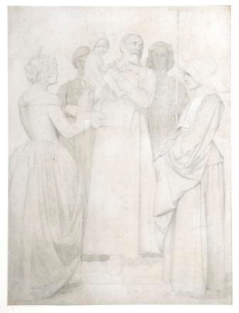 This drawing depicts the priest of the Catholic church who was dedicated to serving the poor. He is shown holding a young child and surrounded by four figures. This is a compositional preparatory drawing for a fresco painting now in the Musée Georges-Garret, Vesoul (Gerome’s hometown) which he painted for the sisters of St Paul.