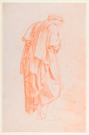 This drawing man shows a figure standing in traditional robes. In 1853 Gerome travelled to the Middle East and this began to influence his subject matter. On his travels, Gerome collected artefacts and clothing for staging scenes in his studio. The figure is viewed from the rear and the focus of the drawing is on the drapery.
