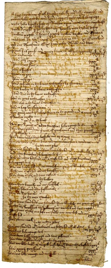 Compiling an inventory served several functions. Not only did it protect the executor from allegations of fraud and safeguard the beneficiaries’ inheritance; it was also the basis on which court fees were calculated. The survival of probate inventories is patchy, because they were not always kept, and as time went on the custom of compiling one gradually declined in importance. As in the case of the inventory of Bolton upon Dearne’s John Bingley, most inventories relate to the estates of farmers, not surprising considering the agricultural nature of Britain before the Industrial Revolution. From them we can discover what crops were grown, the number of livestock kept, the farming implements used and other useful details. They were usually compiled on a room by room basis so this gives us a very clear picture of the home of the deceased. It details his or her furniture, the tools of their trade and what was lurking on the mantelpiece! It’s worth remembering that values given for items are only rough estimates and inventories relate only to moveable assets, fixtures and fittings. Any real estate would still be detailed in the will itself. Inventories also vary greatly in format and content. Some are more useful than others. Nevertheless, they are an invaluable source – each one providing a window into someone’s life – a snapshot from centuries ago!
