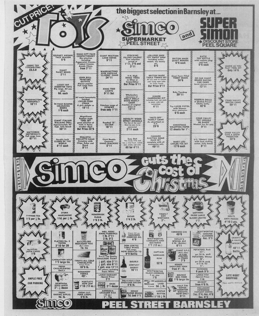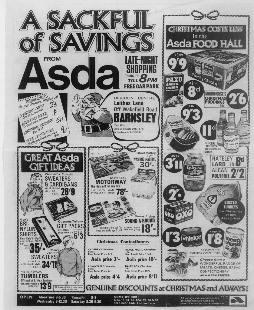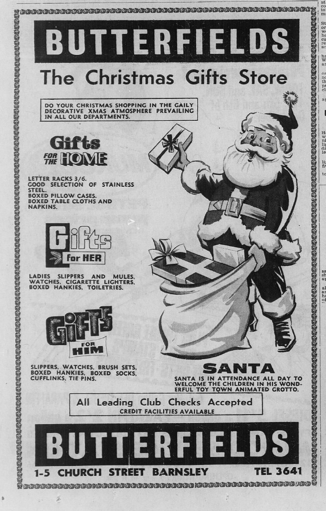We’ve searched The Barnsley Chronicle archive to share adverts from some iconic Barnsley shops. Maybe you went to the popular santa’s grottos at Butterfields or the co-op. Bailey’s on New Street claimed to sell ‘everything but the baby’ Did you know that the first Tesco in Barnsley opened on Albert Street East in 1967? Barnsley Archives holds the complete Barnsley Chronicle archive dating back to 1858. Visit our website for more information about opening times and booking an appointment https://www.experience-barnsley.com/our-archives