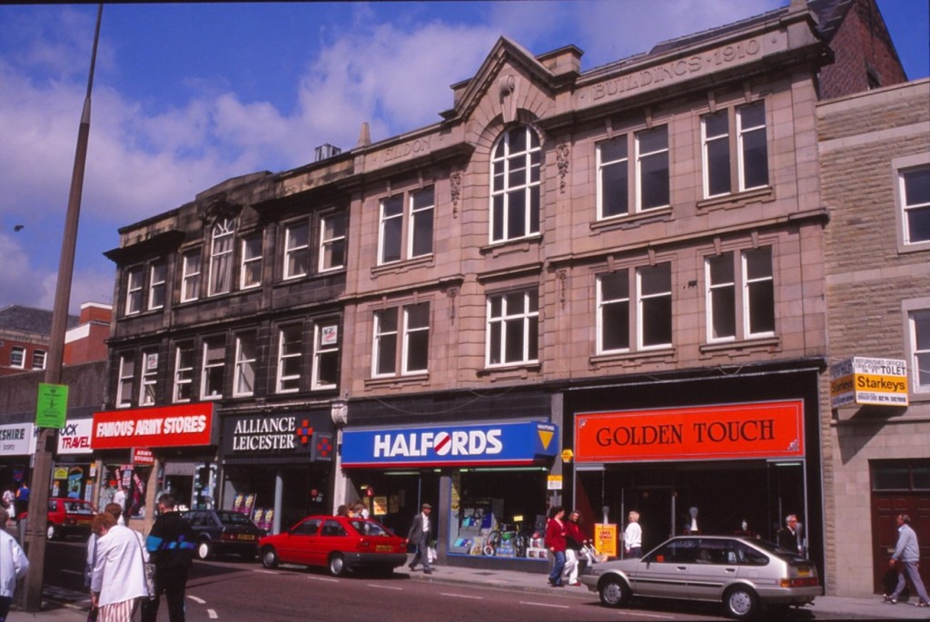 The longest standing shop in the YMCA building was Timpson’s shoe shop. They replaced Ernest Walker at number 14 in the early 1930s and then later in the decade enlarged the shop by taking over number 12 after Holroyd’s left. During the mid-1960s they also occupied number 18 for the shoe repair part of the business. By the late 1970s Timpson’s shoe shop had moved to May Day Green and Hurst Linens took over the lease for numbers 12-14. They were followed by Famous Army Stores (clothing) from the late 1980s until the early 2000s. Other national businesses at number 18 have included Halfords (cycles), Ray Alan (menswear) and Alliance and Leicester (banking).