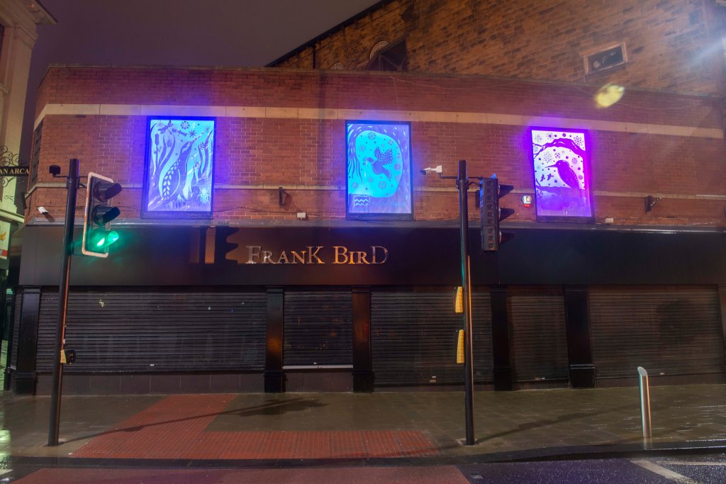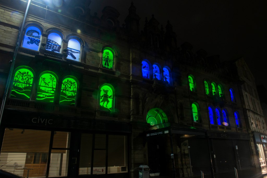 We worked with the brilliant Barnsley Council Arts and Events team to create a HSHAZ animation for an online mayor’s parade (the first ever digital parade in Barnsley) in July, and a series of beautiful Bright Nights windows in historic buildings on Eldon Street during November (by local art collective Creative Recovery) when social distancing was still advised and social gatherings were not permitted.