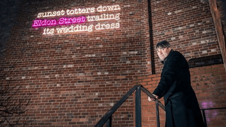 A stunning lightwork ‘sunset’ was also created as part of Simon’s residency, by local artist Patrick Murphy, for Bright Nights (2021). The multi-coloured neon piece uses Simon’s words and evokes the history of Eldon Street as a party street, and the much-loved Benj Harral’s ring shop, where generations of Barnsley people bought their engagement and wedding rings. The light work also served a dual purpose, by illuminating and drawing attention to a dark and run down alleyway off Eldon Street that was in urgent need of improvement. This was a priority for the scheme as a linking route between Eldon Street and the wider town centre, including Mandela Gardens and the Civic. It was intended as a temporary installation, but it has made such a positive impact, and been so popular (including with the neighbouring properties) that it has now been made permanent. More about the alley in the second part of this blog!