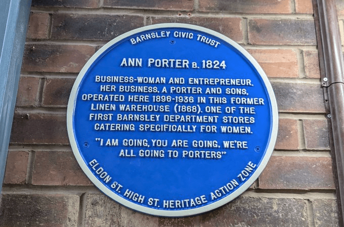 The four year Eldon Street HSHAZ may have come to an end earlier in the year, but we’re hoping that it’s legacy will continue for many years to come. In partnership with Barnsley Civic Trust and following extensive research in Barnsley Archives and Local Studies in the last few years, five blue plaques have now been installed on and around Eldon Street celebrating people and buildings connected to the historic high street.